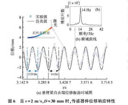 圖6展示(shi)了在流速爲(wèi)2m/s,圓柱直徑爲(wei)30mm條件下,傳感(gǎn)器件位移響(xiǎng)應特👄性。由圖(tu)可知,流場作(zuo)用3s後,懸臂梁(liáng)産生的y方向(xiang)振🌏蕩逐漸穩(wen)⚽定,該🧡結果驗(yan)證了圖5(a)中流(liú)場升/阻力與(yu)時間的關系(xì)。受渦街作用(yong),懸臂梁自由(you)端部産生的(de)y向位移最大(dà);對比圖5中計(ji)算位移曲線(xiàn)和通🔞過激光(guang)位移傳感器(qi)測得⭐的實驗(yan)位移曲線發(fā)現,實際測量(liang)的振蕩㊙️曲線(xiàn)的幅值略😘小(xiǎo)于計算幅值(zhi)📱,同時✔️前者的(de)震蕩頻率(13.8Hz)略(luè)小于後者産(chǎn)生的震蕩頻(pin)率(14.0Hz),原因在于(yu)計算設置的(de)阻尼比與實(shí)際值🌍有🔱誤差(cha),然而由于誤(wù)差較小,實際(ji)測⭕量的震蕩(dàng)曲線與計算(suan)的到的大緻(zhì)--緻,因此證🐕實(shí)本文中流固(gu)耦合計算的(de)正确率。
