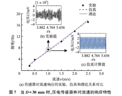 圖7給(gěi)出了圓柱繞(rao)流體直徑爲(wèi)30mm時,人射流速(sù)與PVDF懸臂梁感(gan)知渦街頻率(lü)之間的關系(xi)。主要對比卡(kǎ)門渦街理論(lùn)值,仿🏃🏻♂️真計算(suàn)值♋與實驗值(zhí)。如圖可知,計(ji)算值相比理(li)論值,其與實(shi)驗值♋更爲接(jie)近,其更加正(zhèng)确的反映實(shí)際情況下的(de)渦激振動時(shí)🧡産生的渦街(jie)現象,進🙇♀️--步說(shuō)明本文仿真(zhen)計算的合理(lǐ)。其中,流速爲(wèi)1m/s時的實驗與(yu)計算時域曲(qǔ)線(圖7(b)和7(c))可知(zhī),仿真計算下(xia)的PVDF壓電懸臂(bì)梁産生的電(dian)壓響應☔信号(hào)穩定,在渦街(jiē)穩定後其電(dian)壓幅值随時(shí)間💔幾乎恒定(ding).這說明此時(shi)懸臂梁🥰在y方(fāng)向的⭐振蕩幅(fu)值穩定;而對(dui)比圖7(b)可知,實(shí)際條件下采(cai)集的電壓時(shí)域曲線在幅(fú)值大小上🎯随(sui)時間波動較(jiao)爲明顯,即周(zhōu)期内的Ux-Ug值往(wǎng)往不穩定,在(zài)該曲線😄上會(huì)疊加包括電(dian)路幹擾,工頻(pín)十‼️擾,以及流(liu)場對壓♊電梁(liang)産生💋的x方向(xiang)的振動影響(xiǎng)。在此情況下(xià),若根據前人(rén)叫采用提取(qu)電壓的Ux-Ug值,0-Ug值(zhí)或U....的方法來(lai)表征🔴壓電梁(liang)感知渦街的(de)特性往往并(bing)不正确,而通(tong)過提取功率(lü)的方法更爲(wèi)正确,因此本(ben)文采用通過(guò)提取頻域曲(qu)線中渦激頻(pin)率下的㊙️功率(lü)表征渦街的(de)傳感強度。此(ci)外,由圖7可知(zhī),仿真中,PVDF壓電(diàn)懸臂梁可檢(jiǎn)測的流速爲(wèi)0.3m/s,此時該懸臂(bi)梁産生的振(zhen)動約爲2.0Hz,該值(zhí)與理論值及(ji)實驗值接近(jin),進一步說明(míng)了本文仿真(zhēn)計🛀算的合理(li)。