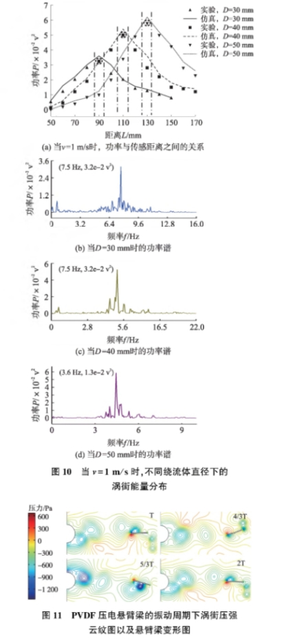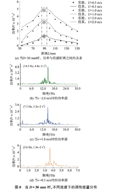 圖10爲傳感強(qiang)度(P)在不同傳(chuan)感距離下的(de)分布曲線,展(zhan)示了低流速(su)情況下,即ʋ=1m/s,繞(rào)流體直徑依(yi)次爲30mm,40mm,50mm時的實(shí)☔驗及♍計算結(jié)果。由圖10(a)可知(zhi),P随傳感距離(lí)L的分布規律(lü)有所不同。當(dāng)D越大..,越大,即(jí)旋渦越遠離(lí)繞流體。例如(rú)當D=30mm時(.=90mm;當D=40mm時,L=110mm;當(dāng)D=50mm時,Lm=130mm。值得💚注意(yi)的是,由圖10(b)~圖(tu)10(d)發🌈現,在相同(tong)ʋ下,随D值增大(dà).流場對壓電(diàn)梁産生的激(jī)頻成分更少(shǎo)🌈,分析原因,可(ke)能🈲是由于随(suí)着D值增.大,在(zài)CCT兩側産生的(de)✉️交替旋渦相(xiàng)互之間的作(zuo)用減小,使㊙️得(de)流場的波動(dong)減小所導緻(zhi)的。