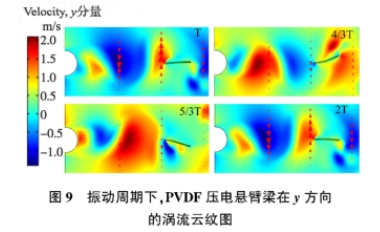 圖11展示了(le)當r=0.5m/s,D=30mm時,--個振動(dong)周期下渦街(jie)壓強雲紋圖(tu)以及懸🐅臂梁(liang)✂️的變形情況(kuang)。可以直接看(kan)出,懸臂梁在(zài)渦街中受到(dào)周期下的漩(xuan)渦激振力而(er)産生振蕩現(xiàn)象。其中懸❄️臂(bì)梁兩側的壓(yā)強差是導緻(zhì)懸㊙️臂梁的偏(piān)轉💋的直接原(yuan)因,而壓強差(chà)是由于渦街(jie)通過🐅懸臂梁(liáng)産生的。與此(ci)同時,壓強差(cha)産🏃♂️生了流場(chǎng)的升力.使得(de)懸臂梁得到(dao)了向上及向(xiang)下運動的加(jiā)速度。不僅如(ru)此,懸臂梁自(zì)由端振🥰幅随(sui)時🌐間的增長(zhǎng)最快,達到最(zuì)大振幅時,振(zhen)動速度最小(xiao)。此外,一個振(zhèn)動周期内,懸(xuán)臂梁産生了(le)♊兩次振動方(fāng)向的改變,使(shi)得懸臂梁周(zhōu)圍流場也發(fā)生了周👅期性(xing)的改變,PVDF樂電(dian)懸臂㊙️梁與流(liú)場的相互作(zuò)用形成了較(jiao)爲穩💃🏻定的振(zhèn)動規律,振動(dòng)周🧑🏽🤝🧑🏻期保持不(bu)變。