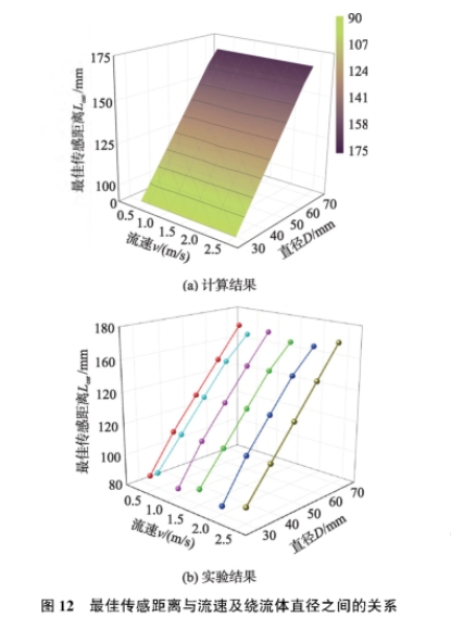 圖12爲傳感(gǎn)距離與流速(su)及繞流體直(zhí)徑之間的計(ji)算🏃♀️及實驗關(guān)系👅。由圖12(a)可知(zhī)随D值增大逐(zhu)漸增加,且近(jìn)似線性關系(xi)。同時✌️,測量曲(qǔ)線⭐與計算曲(qǔ)線--緻。分析原(yuán)因,根據圖4及(ji)式(10),最住傳感(gan)距離應該在(zai)旋渦的成熟(shú)區,D增大時,其(qi)兩側剪切層(céng)之間距離變(bian)大,其相互作(zuò)用變慢,使漩(xuán)渦的脫落頻(pín)率減小,使得(dé)旋渦産生位(wèi)置距繞流體(ti)越遠,即最住(zhu)檢測位置越(yue)遠離圓柱🈲繞(rao)流體。由圖12(a)進(jìn)一-步可知,與(yu)ʋ無🛀關,這與圖(tu)8(a)的分布曲線(xiàn)一🌈緻。