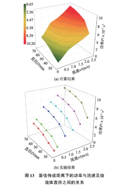圖13爲傳(chuán)感距離下的(de)P值(P..)與o,D之間的(de)計算及實驗(yàn)關系。由💚圖☁️13(a)可(ke)知,P.随。增大而(er)遞增,同時随(suí)D增大而遞增(zēng);同時,測量曲(qǔ)線與計算曲(qǔ)線保🛀持-緻。分(fen)析原内.根據(jù)式(9),由Re與txD成正(zhèng)比關系,Re增加(jia),導緻其升力(lì)系數增大,即(jí)反映流場波(bo)動越劇烈,此(ci)時結構表面(miàn)所受壓力增(zēng)加,導緻PVDF壓電(dian)梁的振蕩幅(fu)值變大,産生(shēng)的壓電功率(lü)越高。其中圖(tu)13(b)顯示,當v=2.5m/s,D=70mm.,P..約爲(wei)10x10*mW;當0=0.5m/s,D=30mm,P.約爲8x102mW。可推(tuī)測,若流速和(hé)⛱️直徑同時分(fen)别小于0.5m/s和🧡30mm,産(chǎn)生的P..,将小于(yú)8x10*mW。然而如果用(yong)時域電壓的(de)Ua-U。值、0-U2值或U的方(fang)法來表征壓(ya)電梁感知渦(wo)街的特性往(wang)往🔞會被噪聲(shēng)幹🌂擾,難以提(ti)取特征量。這(zhe)也進一步證(zheng)明了木文采(cai)用提取功率(lǜ)來表征渦街(jiē)在傳感距離(li)上傳🏃感強度(dù)的合理性。