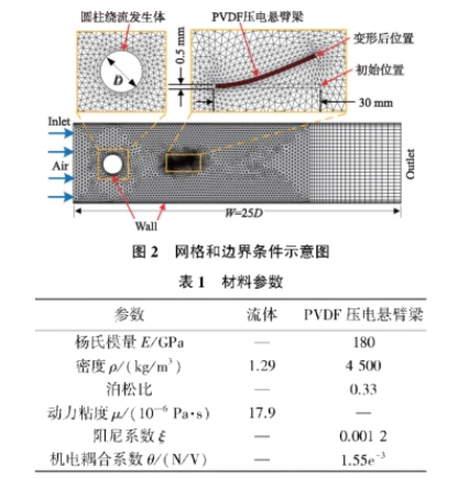 将上述(shù)PVIV流速傳感器(qì)簡化爲一個(gè)二維物理模(mo)型,如圖2所示(shi),其🔞中.D爲圓柱(zhù)型渦流發生(sheng)休直徑,計算(suan)域爲25Dx5D的矩形(xing),壓電懸臂梁(liang)🚶♀️位于圓柱的(de)中軸線上.左(zuo)端固支。模型(xíng)中,範圍在0.3m/s~2.5m/s,D範(fan)圍🥰在30mm~70mm,即雷諾(nuò)數在🐇500~9800之間。選(xuan)取空氣域材(cái)料📐參數,采用(yòng)SIMPLE求解器,進行(hang)瞬态分析,計(ji)算材🐆料參數(shu)如表♊1所示。采(cai)用二角形非(fēi)結構化的網(wǎng)格劃分,在圓(yuan)柱和⭐PVDF壓電梁(liáng)的核心區域(yu)網格分布較(jiao)密集。