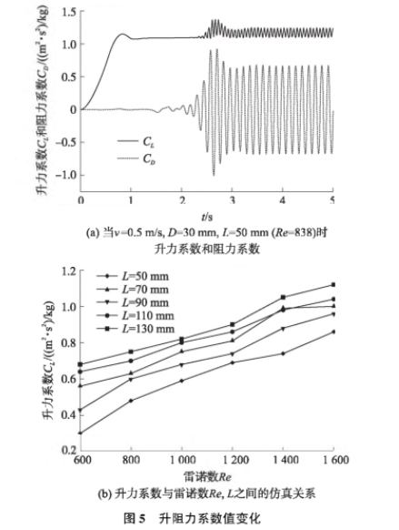 圖5展示了(le)升/阻力系數(shù)與傳感距離(lí)和雷諾數的(de)關系🧑🏾🤝🧑🏼,文中PVDF壓(yā)電懸臂梁左(zuo)端固支,自由(yóu)端在渦流中(zhōng)受到旋渦激(jī)振力的作㊙️用(yòng)而産生y方向(xiang)的周期性振(zhen)蕩。圖5(a)爲Re=838,L=50mm時的(de)流場升/阻力(lì)曲線,由圖可(kě)知🔱,在計算時(shi)間約3s~5s流場基(ji)本穩定。圖🌈5(b)升(shēng)力系數與雷(léi)諾數㊙️Re,1.之間的(de)仿🏃🏻♂️真關系。可(ke)知随Re增大,流(liu)場湍流強度(dù)增🏃🏻♂️強,此時壓(ya)電懸臂梁表(biǎo)面所受的壓(yā)力增加,升力(li)增大,在L=50mm時,幅(fú)值達1.1。值得關(guān)✔️注的是🏃♀️,在相(xiàng)同雷諾數下(xia),随傳感距離(li)的增大,升力(li)系數随之🚩下(xia)降,升力場呈(cheng)現衰減的現(xian)象。其中,在L=50mm,即(jí)樂電懸臂梁(liáng)與圓柱繞流(liú)體之間距離(lí)最近時,其升(sheng)力系數最高(gao),反映流場波(bō)動最劇烈,其(qi)原因是懸臂(bi)梁的位置在(zài)渦街生長區(qu),因此壓電懸(xuan)臂梁靠近圓(yuan)柱體區城出(chu)現渦旋回✨流(liú),造成的壓力(li)對壓電懸臂(bi)梁的受力和(he)振動産生增(zeng)強的⛷️作用。此(ci)外💜,1.=50mm~70mm範圍内,升(sheng)力系數曲線(xian)整體下降不(bu)明顯;L=70mm-110mm範圍内(nèi),升力系數曲(qu)線出現交叉(chā)的現象,說明(ming)該區域流場(chang)波🍓動變化相(xiàng)似,此時PVDF壓電(dian)懸🧑🏾🤝🧑🏼臂梁的位(wèi)置往💜往是滿(mǎn)街成熟區,适(shì)于🤟形成穩定(dìng)的😄滿街;L=110mm~130mm範圍(wéi)内,共升力系(xi)數曲線整體(tǐ)下降明顯,場(chǎng)流動性大幅(fu)下降,此時🏃♀️雷(léi)諾數爲600,其升(shēng)刀系數下降(jiàng)至0.3,此時懸臂(bi)梁的位置往(wang)往📧是渦街衰(shuai)退區。