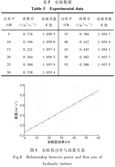 通過效(xiào)率試驗測得相(xiang)關數據,在實驗(yan)中改變出力💘P來(lái)測流量💯Q,并根據(ju)上述分析得到(dao)了流量系數K值(zhí),數據如表5所示(shi),水輪機功率🐪與(yu)流量的關系如(rú)圖8所示。