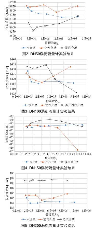 按照2.3中(zhong)的實驗方案對四(sì)台不同口徑的渦(wo)街流.量計在👅水、空(kōng)氣、蒸汽三種介質(zhi)下進行儀表系數(shù)實流标定實驗,實(shí)驗結果如圖2~5所示(shi)。