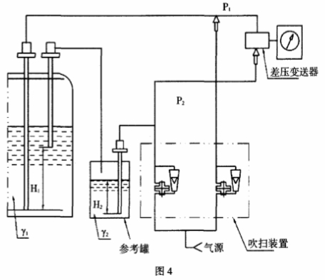 如圖4所示,如果(guǒ)已知被測介質(zhi)液位H1與參考介(jiè)質液💯位🏃♂️H2已知參(can)🏃♀️考介質密度γ2,利(li)用差壓變送器(qi)測量的壓差,就(jiu)可以測量出被(bei)👈測介質密度γ1。