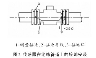 傳感器安裝(zhuāng)在塑料管道(dào)或内壁有絕(jue)緣塗層、襯裏(li)的管道上,兩(liang)端應安裝接(jiē)地環(或帶有(you)接地電極的(de)金屬短管❓),然(rán)後用導線連(lián)☎️接,使管内流(liú)動的介質與(yǔ)大地短📐路,具(jù)有零電位⭐(見(jian)圖 2)。
