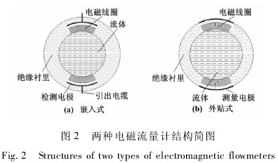 流(liu)量計是利用(yong)物理原理實(shi)現對一段時(shi)間内流體流(liu)量測量的🐆儀(yi)器。電磁流量(liàng)計具有寬量(liàng)程、耐腐蝕、結(jie)構簡單等優(yōu)點,是當前常(cháng)用的流量計(ji)品🥵種之一。電(dian)磁流量計的(de)理論産生于(yu)20世紀20年代。當(dang)😍代電磁流量(liàng)計大多以計(jì)算機技術爲(wèi)基礎,其功能(néng)随着㊙️計算機(jī)的信息處理(li)能力、存儲能(néng)力、運算能力(li)和計算機的(de)控制功能的(de)增強而增強(qiáng)。電磁流量計(ji)革新的四個(gè)方向值得關(guān)注:電磁流量(liàng)計的結構、電(diàn)磁流量計的(de)勵磁方♉式、電(dian)磁流量計的(de)信号處理技(ji)術以及電磁(cí)流量計的智(zhi)能化等。本文(wen)以此爲線索(suo),總結電磁💯流(liú)量計的發展(zhǎn)曆程并分析(xi)其發展趨勢(shi)。 1電磁流量計(ji)結構 電磁流(liú)量計是利用(yòng)電極與流體(ti)構成一個回(huí)路來測量回(hui)路中⭐産生的(de)電參數。傳統(tong)電磁流量計(jì)測量☎️原理⭐如(rú)圖1所示。電磁(ci)線圈在直徑(jìng)爲d、橫截面積(ji)爲A的❓管道中(zhong)産生一個磁(cí)場強度爲B的(de)磁場☔。當有流(liu)體經過時會(hui)切割磁感線(xiàn)而産生感應(ying)電動勢U,測量(liàng)電極🐉接收電(diàn)動勢♻️信号。由(yóu)公式可計算(suan)其流量。式中(zhōng):Q爲流量;k爲修(xiu)正系數。 由于(yú)傳統的電磁(cí)流量計無法(fǎ)測量低電導(dao)率的流🍉體,且(qie)對摩擦⁉️、粘附(fù)效應敏感,隻(zhi)能測量流體(ti)滿管情💚況等(děng)🙇🏻,因此需要改(gǎi)變其結構,使(shǐ)其能夠适應(ying)更複雜💰的環(huan)境。改變電磁(ci)流量計結構(gou)🐅的主要方法(fa)是改變電極(ji)的數量和位(wèi)置🙇♀️,從而形成(chéng)電容電磁流(liu)量計、非滿管(guǎn)電磁流量計(ji)等。 1.1電容電磁(ci)流量計 電容(rong)式電磁流量(liàng)計從根本上(shang)解決了電極(ji)表面附着、腐(fu)🙇♀️蝕、摩擦🔞等問(wèn)題,其電極與(yu)被測流體間(jiān)有絕緣♋襯裏(li)隔離,或者✨直(zhi)接👣采用絕緣(yuan)測量管。電極(jí)置于測量管(guǎn)外面或鑲🍉嵌(qiàn)于測量管内(nèi)🌍部。嵌入式電(diàn)磁流量計和(he)外貼😄式電磁(ci)流量計的結(jie)構如圖2所示(shì)。 電極與被測(cè)流體通過絕(jué)緣管形成檢(jian)測電容,通過(guo)此電容來㊙️耦(ou)合流量信号(hao)。其主要的結(jié)構形式按照(zhào)電極的安裝(zhuang)位置可以分(fèn)爲兩種:電極(jí)嵌入測量管(guǎn)的絕緣❓襯裏(li)内部(嵌入式(shi))、電極🔱貼在測(ce)量管外部(外(wài)貼式)。嵌入式(shì)結構與普通(tong)電磁流量計(ji)結構相似,而(er)外貼式大多(duo)是通過陶瓷(cí)表面金屬化(hua)技術将電極(jí)貼在測量管(guan)外。 1.2非滿管電(diàn)磁流量計 普(pǔ)通的電磁流(liú)量計隻能測(cè)量滿管流的(de)流量,而很多(duo)🏃情況‼️下由于(yú)流量流速很(hěn)快,有時充不(bú)滿管道,普通(tōng)的電磁🧡流量(liang)🚶♀️計不能适用(yòng),因此希望電(dian)磁流量計能(neng)夠進行非滿(mǎn)管流量的測(ce)量。目前市面(mian)上常見的📐非(fēi)滿管電磁流(liú)量計有下面(mian)幾種。 ①多電極(ji)式非滿管電(dian)磁流量計。其(qí)底部是一對(dui)信号注入🔞電(diàn)🈚極,中間有多(duō)對測量電極(jí),頂端有一個(gè)滿管電極。在(zai)滿♌管情😘況下(xia),該流量計與(yu)普通的電磁(cí)流量計的功(gong)能相同,滿管(guan)情況下流體(ti)的橫截面積(ji)是固定的,此(ci)時☀️計算流量(liàng)值隻需要測(cè)量流體的流(liú)速即可。當流(liú)體非滿管時(shi),滿管電極檢(jian)測到管道非(fēi)滿狀💁态,利用(yong)算法修正測(ce)量值,此時流(liu)量計的測量(liang)方式改成測(cè)量流體流速(su)和液面高度(du)。信号注入電(diàn)極與在不同(tong)位置的三對(duì)測量電極共(gong)同工作,用于(yú)測量液位面(mian)的高度和流(liu)體的速度。多(duō)電極式非滿(mǎn)管電磁流量(liang)計結構簡圖(tu)如圖3所示。 ②電(dian)容式非滿管(guǎn)電磁流量計(jì)。電容式非滿(mǎn)管電磁流量(liang)計結構簡圖(tú)如圖4所示。 電(dian)容式非滿管(guan)電磁流量計(jì)就是利用液(yè)位的變化☔使(shǐ)得電容的極(ji)距發生變化(huà),通過測量發(fā)送電極和檢(jiǎn)測電極之間(jiān)的電😍容耦合(hé)值即可測量(liàng)流量值。 ③利用(yong)阻抗或信号(hao)衰減的非滿(man)管電磁流量(liàng)計。這種結構(gou)🍉的非滿管電(dian)磁流量計是(shì)當前的方向(xiàng)之一。其結構(gou)是流💰量管底(di)部貼一對信(xin)号發射電極(jí),在流量管中(zhong)間貼信号接(jie)收電極。由于(yu)信号在流體(tǐ)中傳播會産(chǎn)生衰減,且傳(chuán)播時間越長(zhang),衰減越多,因(yin)此通過☀️信号(hao)接收電🐕極接(jie)收到的🈲信号(hào)衰減量📞即可(ke)得知液面高(gāo)度;同時該電(diàn)極還能測量(liàng)流體切割磁(ci)感😄線産生的(de)電動勢,以此(cǐ)達到測🚶♀️量非(fēi)滿管流量的(de)目的。阻抗式(shi)或信号衰減(jian)非🔴滿管電磁(ci)流量計結構(gòu)簡圖如圖5所(suǒ)示。 ④智能化非(fēi)滿管電磁流(liu)量計。這種流(liú)量計是電磁(cí)流量計智❄️能(neng)化💃🏻發展的方(fāng)向之一。使用(yòng)兩種接法不(bu)同的勵磁線(xian)圈,應用權🐆重(zhong)函數與幾何(hé)位置有關的(de)原理,建立液(ye)位