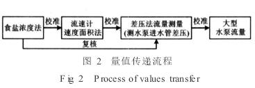 泵站曾按ISO标準(zhun)規定位置布置(zhì)26台流速計,測量(liang)大型水泵3.5m×1.5m矩形(xing)出水流道平均(jun1)流速,以校準用(yong)差壓法測💛量泵(bèng)進水道差壓的(de)流出系數,測量(liang)流速在1.2~1.3m/s之間。期(qī)間還用食鹽濃(nóng)度法校準流速(su)計面積🌐法,在實(shí)驗過程中再用(yòng)食鹽濃度法複(fú)核流👨❤️👨速計面積(jī)💛法的數據[3]。量值(zhi)傳遞流程如圖(tú)2所示。