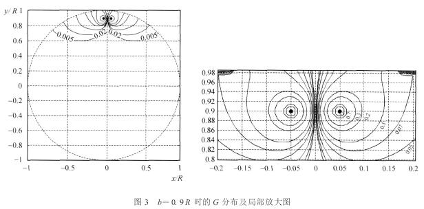 取(qu)b= 0.9R(R爲管道(dao)半徑),θ= 0.0555rad,繪(huì)制G分布(bu)并放大(da)電極附(fu)近區域(yù)如圖3所(suo)示。