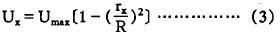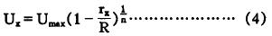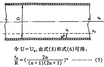 流體處于紊流(liú)時,在半徑方向上(shang)距管路中心軸線(xian)rx處的最大流速Ux用(yong)下式計算: