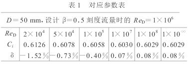 設有一套(tào)法蘭取壓(yā)的孔闆測(ce)量裝置,D=50mm,設(she)計β=0.5刻度流(liú)🐅量時的ReD0=1×106,設(she)ReD1=2×104、ReD2=5×104、ReD3=1×105、ReD4=1×107、ReD5=1×108、ReD6=1×108,經過查表(biao)或計算得(dé)出C0=0.6034;C1~C6見表1,δ=(Ci-C0)/C0。