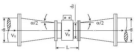 爲了在安裝異(yì)徑管後不過多影(yǐng)響流速的分布,不(bu)影響電磁流量計(ji)的精度,要求異徑(jìng)管的中心錐角 α不(bu)大于15°,越小越好。這(zhe)樣可把異徑管視(shi)爲直管段的一部(bù)分。