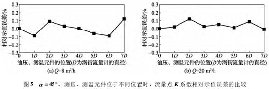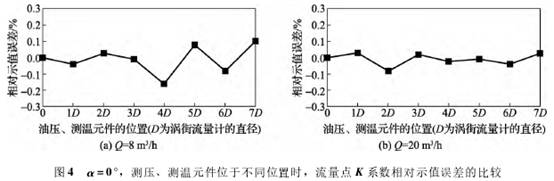 摘要:在對(dui)渦街流量計(jì) 檢定時,可能(néng)需要使用測(ce)壓、測溫元件(jiàn)去測量流經(jing)👄流量💞計的流(liu)體溫度、壓力(li),以保證流量(liàng)計計量的準(zhun)确性。然而部(bù)分插入式測(cè)壓、測溫元件(jiàn)是需要插入(rù)流體中,這樣(yang)相當于在流(liu)量計的渦街(jie)發生體後面(miàn)的旋渦中在(zài)放置了📱一鈍(dùn)體,此鈍體可(kě)能會影響已(yǐ)經形成的旋(xuán)渦,也可能會(huì)影響旋渦脫(tuo)落的頻率,從(cóng)而有可能影(yǐng)📐響流量計的(de)計量性能。 1概(gài)述 流體流經(jīng)靜止的鈍物(wù)體時,會在物(wù)體後面形成(chéng)規🔞則的旋㊙️渦(wō)脫落。自從1878年(nian)VincencStrouhal測量出旋渦(wō)脫落頻率和(he)1911年VonKarman研究雙排(pai)旋渦脫落的(de)穩定性分析(xi)以來,旋渦脫(tuō)落變成了流(liú)體力學的基(ji)本問題。然而(er)渦街流量計(ji)正是利用了(le)🆚這個原理,流(liu)體流過旋渦(wo)發生體時,會(hui)在發生體下(xià)遊兩側交替(tì)地分離釋放(fàng)出兩列有規(guī)律的交錯排(pai)列的旋渦,即(ji)卡門渦街[1],并(bing)使用傳感器(qì)測出旋渦脫(tuo)落的頻率,通(tong)過式(1): 進行換(huàn)算,以達到對(dui)流量的計量(liàng)(式中,b爲發生(sheng)體的🥵寬🐆度;u爲(wei)流經流量計(jì)的流體平均(jun)速度;f爲旋渦(wō)的頻率;Sr爲斯(sī)特羅哈爾數(shu))[2]。根據JJG1029—2007渦街流(liu)量計檢定規(gui)程的要求,在(zai)對渦街流量(liàng)計🈲檢定或校(xiào)準的過程中(zhōng),如需要測量(liang)流經流量計(jì)😍的流體溫度(dù)或者流體壓(ya)力時,可以在(zài)流量計下遊(yóu)(2-5)D或者(2-7)D處分别(bie)設置測溫孔(kong)、測壓孔[3](其中(zhōng)D爲流量計口(kou)徑)(圖1)。在實際(ji)工作中,對渦(wo)✍️街流量計檢(jiǎn)測時,測溫或(huo)測壓都是使(shi)用傳感器,而(er)且大⚽多‼️數的(de)傳感器是需(xū)🏃♂️要插入管道(dao)内部;如果進(jìn)行此✂️操作,相(xiàng)當于在流量(liàng)計✍️渦街發生(shēng)體的後面旋(xuan)渦中🛀🏻在放置(zhì)了一鈍體❄️,此(cǐ)鈍體📞可能會(hui)影響已經形(xing)成的旋渦,也(yě)可能會影響(xiang)旋渦😍脫落的(de)頻率,從而有(you)可能影響流(liú)量計的計量(liang)性能🐕。本文就(jiu)是研究測溫(wen)、測壓傳感器(qì)安裝的位置(zhi)l,以及和旋渦(wo)發生體形成(cheng)的角💔度α對渦(wō)街流量計計(ji)🔴量性能的影(yǐng)響(圖2)。 2實驗模型(xing)和實驗參數(shu) 選擇精度1.0級(jí)、口徑爲DN50的渦(wo)街流量計做(zuo)實驗,根據說(shuo)明🔞書,流量計(jì)的可測範圍(wéi)爲2.2~73m3/h、可保證精(jing)度的測量範(fan)圍爲3.3~73m3/h[2],流量計(jì)的輸出方式(shì)💘設置爲脈沖(chòng)輸出;另外,選(xuan)擇一長度15cm,直(zhí)徑爲6mm的不💜鏽(xiù)鋼小圓柱,用(yong)作模拟插入(ru)式測壓、測溫(wēn)元件(以下簡(jian)稱爲模拟元(yuán)件),以方便實(shi)💯驗。 在進行實(shi)驗前,先使用(yòng)若幹模拟元(yuán)件将管道上(shang)的小孔堵😍住(zhu),密封以防止(zhi)漏水,但模拟(nǐ)元件不得插(cha)入管道中,保(bao)💋證模拟元件(jian)的一端和管(guǎn)道壁平齊,并(bìng)在模拟元件(jiàn)上做好記号(hào),以保證重複(fu)實驗時,對實(shi)驗結果的影(yǐng)響盡量減小(xiao)到最小。實驗(yàn)時,先🍓對無模(mó)拟元件影響(xiǎng)的狀态進行(hang)檢🙇♀️測,流量點(diǎn)爲qmax和0.40qmax(其中qmax=20.0m3/h),每(mei)個流量點測(ce)量5次,取平均(jun1)值進行🥵比較(jiào)。在α分别選擇(zé)了0°、45°、90°三個不同(tóng)角度時,在渦(wo)街🐕流量計下(xià)遊1D~7D的距離插(chā)入模拟元件(jian),插入深度爲(wèi)0.5D,測量各種實(shí)驗狀态下渦(wō)街流量計各(ge)流量點的K系(xì)數,以研究l,α對(dui)實驗結果的(de)影響。實驗裝(zhuāng)置如圖3所示(shi),按照JJG1029—2007《渦街流(liú)量計檢定規(gui)程》的要求進(jìn)行檢定。 3參數(shu)l、α對渦街流量(liang)計示值誤差(cha)的影響 通過(guò)測量,取得各(gè)種實驗狀态(tài)下的K系數,選(xuǎn)擇無模🔴拟🏃元(yuán)件影響的實(shi)驗K系數爲基(jī)礎數據,與其(qi)他實驗狀态(tài)下的實驗結(jié)果進行對比(bi)。 如圖4所示,圖(tú)中橫坐标爲(wèi)0,表示無模拟(nǐ)元件影響,1D~7D表(biǎo)示模拟元件(jian)所放的位置(zhì),縱坐标表示(shi)渦街流量計(jì)K系數的相對(duì)示值誤差。從(cóng)🐇圖4(a)中可以看(kan)出,當α=0°、流量點(diǎn)Q=8m3/h,模拟元件在(zai)3D~7D時,對流量計(jì)的K系數影響(xiang)比較大,最大(dà)影響接近❗0.2%。而(er)當流量增加(jiā)至Q=20m3/h時,模拟元(yuán)件對流量計(ji)K系數影響比(bi)較平穩,保持(chi)在±0.1%以内。 當α增(zēng)加至45°,流量點(dian)Q=8m3/h,模拟元件位(wèi)于不同位置(zhì)時,K系數的相(xiang)對示值誤差(cha)位于±0.1%之間,表(biǎo)示模拟元件(jian)放置不同位(wei)置,可以導♻️緻(zhì)K系👄數變大或(huo)變小(圖5(a))。在大(da)流量情⭐況下(xia)(Q=20m3/h),從圖5(b)中,可以(yi)發現K系數幾(ji)乎都是比實(shi)際值變大的(de),且變化幅度(du)基本位于0%~0.1%範(fàn)圍。 繼續增大(da)α至90°,即模拟元(yuán)件和渦街發(fa)生體相互垂(chui)直。從圖6(a)中可(kě)以💔看出,當流(liú)量點Q=8m3/h,模拟元(yuán)件位于不同(tóng)位置時,K系數(shu)的相對示值(zhi)誤🤩差波動很(hěn)大,最大變化(huà)多至0.25%。當流量(liàng)Q爲20m3/h,模拟元件(jian)位于1D處時,K系(xi)數相對