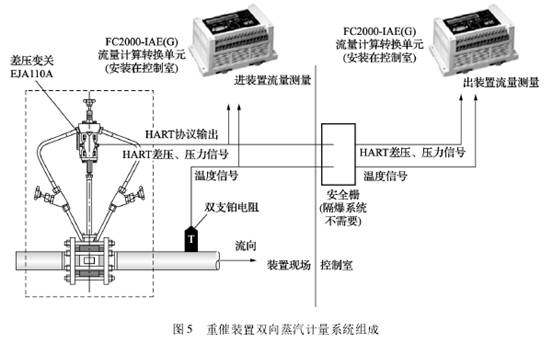 摘要:在煉油(you)化工生産中(zhōng)經常出現一(yi)條蒸汽管道(dào)雙🚩向輸✌️送蒸(zhēng)💘汽的情況,本(ben)文就實現重(zhong)油催化裂化(huà)✍️裝置在進、出(chu)裝置兩個方(fang)向蒸汽質量(liàng)流量的實時(shí)、準确測量問(wen)題🍉,提出了💃一(yī)種應用多參(can)量雙向流 一(yī)體化節流式(shì)流量計 的計(ji)量解決方案(àn),并具體就一(yi)體化雙向孔(kǒng)闆流量計 的(de)工作原理、計(ji)量系統組成(chéng)、功能特點、雙(shuang)向流測量的(de)實現⭕過程以(yi)及實際應用(yong)效果進行了(le)介紹。 0引言 許(xu)多煉化生産(chǎn)裝置,如催化(hua)裂化裝置、焦(jiao)化裝置、連續(xu)重整裝置等(děng),常利用裝置(zhì)餘熱産出蒸(zhēng)汽,這些裝置(zhì)在正常生産(chǎn)期間的自産(chǎn)蒸汽大多被(bei)裝置内部使(shi)用,多餘部分(fen)再外排輸出(chu)至系統管網(wǎng),在裝置開停(tíng)工或加工負(fù)荷小,自産蒸(zhēng)汽不足的情(qíng)🛀🏻況下,又需🐪要(yao)引入系統管(guǎn)網蒸汽作爲(wei)動力或熱源(yuan)。因此,裝置蒸(zheng)汽母管與系(xì)統管網之間(jian)呈互供狀态(tài),這就帶來了(le)如何在同一(yī)管道中實現(xian)雙向流蒸汽(qi)流量實時💞測(ce)量的問題。蒸(zhēng)汽單管雙向(xiang)互供,客觀上(shàng)♋造成了計量(liàng)的困難,也對(dui)生産裝置的(de)能耗統計核(he)算影響很大(da)。常規解決辦(bàn)法是在同一(yi)條管線上安(ān)裝正反兩套(tào)标準孔闆進(jìn)行測量,但是(shi)往往出現直(zhí)管段難于保(bǎo)證,壓力損失(shi)也成倍增加(jiā),造成裝置能(neng)耗額外增加(jia),同時因工藝(yi)流程和裝置(zhi)負荷變化,管(guan)道中蒸汽流(liú)向發生改變(biàn)時,難以實現(xiàn)對任何一個(gè)方向蒸汽🥰流(liu)量的實時、準(zhun)确測量和監(jiān)測,不利于🐕生(shēng)産運行控制(zhi)和節能降耗(hào)。随着流量計(ji)量新技術的(de)發展,流量二(er)次表功能逐(zhú)漸完善,使🈚得(dé)雙向孔闆流(liú)量計在測🌐量(liàng)蒸汽雙向流(liú)量方面得到(dào)了推廣和應(yīng)用。 1雙向孔闆(pǎn)流量計工作(zuò)原理 傳統的(de)标準孔闆入(rù)口爲直角,出(chu)口爲45°倒角,不(bú)能測量反向(xiang)流量,如圖1所(suo)示。雙向孔闆(pan)的入口和出(chu)口結構相同(tong),均爲直角,可(ke)😄分别測量雙(shuāng)方向流量,其(qi)結構⛱️如圖2所(suǒ)示。雙向孔闆(pǎn)流量計就是(shì)依據在GB/T2624.2設計(ji)與加工的不(bu)切斜角、兩個(gè)端面、厚度和(he)節流孔的兩(liǎng)個邊緣符合(he)規定要求的(de)孔闆。在GB/T2624.2—2006/ISO5167—2:2003《用安(an)裝在圓形截(jie)面管💰道中的(de)差壓裝置測(ce)量滿管流體(ti)流量第二部(bu)分:孔🈲闆》中,對(dui)雙向孔闆做(zuò)了詳細的規(guī)定,隻要按照(zhao)标準設計制(zhì)造和安裝,就(jiu)能獲得标準(zhǔn)所規定的準(zhǔn)确度。 雙向孔(kǒng)闆測量蒸汽(qì)雙向流,與标(biao)準孔闆流量(liang)計的工作原(yuán)理是一緻的(de),主要區别是(shi)節流件形式(shì)和二次表👨❤️👨功(gōng)能不同,此外(wai)還需✏️要增加(jia)一台差壓變(bian)送器。測量流(liu)量的基本原(yuán)理,就是以流(liú)動連續性方(fang)程(質量守恒(héng)定律)和伯努(nǔ)㊙️利方程(能量(liàng)守恒定律)爲(wèi)基礎的。當充(chong)滿管道的流(liu)體流經管道(dào)内的節流件(jiàn)時,流💛速将在(zai)節流件處形(xíng)成局部收縮(suo),因而流速增(zeng)加,靜壓力降(jiàng)低⭕,于是在節(jie)流件前後便(biàn)産生了靜壓(yā)力差🏒。流體流(liú)量愈大,産生(shēng)的壓差愈大(da),這樣可依據(jù)壓差來衡量(liang)流量的大小(xiao)。孔闆流量計(ji)測量流量的(de)基本📐公式如(rú)下: 式中:qm爲質(zhi)量流量kg/s;C爲流(liu)出系數,無量(liang)綱;ε爲可膨脹(zhang)性系數;d爲節(jie)流件開孔直(zhi)徑,m;β爲直徑比(bǐ),(β=d/D);ρ1爲被測流體(ti)密📞度,kg/m3;Δp爲差壓(ya)🎯,Pa。 2一體化雙向(xiang)孔闆流量計(ji)的結構和功(gōng)能特點 2.1一體(tǐ)化雙向孔闆(pan)結構 一體化(hua)雙向孔闆流(liú)量計,采用雙(shuang)向孔闆,裝有(you)雙 差壓變送(sòng)器 ,并配套溫(wen)度、 壓力變送(sòng)器 進行溫度(du)、壓力補償。YJLB系(xi)列一體化雙(shuāng)向孔闆流量(liang)計🈲,是将傳統(tǒng)節流裝置和(hé)兩台智能差(chà)壓變送器優(you)化組裝💞成一(yi)✌️體,采用專用(yòng)轉換單元,使(shǐ)其具備溫度(du)、壓力、流量👅數(shù)據高精度寬(kuan)🤟量程補償的(de)功能,從而構(gou)成🌏一種多參(cān)量雙向流一(yī)體化節流式(shi)新型流量計(ji)量系統。一體(ti)化㊙️雙向孔闆(pan)流🈲量計結構(gòu)如💞圖3所示。 2.2一(yi)體化雙向孔(kǒng)闆主要功能(néng)和特點 1)可實(shí)現雙向流量(liang)測量 一體化(hua)雙向孔闆流(liu)量計可根據(jù)現場管道中(zhōng)蒸汽流💘量㊙️的(de)實際狀況,如(rú)流入端與流(liú)出端壓力的(de)變化,可正向(xiàng)、反👌向雙✍️向測(ce)量蒸汽流量(liàng),使雙流向蒸(zhēng)汽流量的計(ji)量更便捷、更(geng)準确,解決了(le)之前傳統标(biao)準孔闆流量(liàng)計🌍隻能單向(xiàng)‼️測量蒸汽流(liu)量的問題。 2)測(cè)量準确度有(yǒu)依據 一體化(huà)雙向孔闆流(liú)量計由于采(cai)用标準節流(liú)件,測量準确(què)🔴度有依據;可(ke)采用符合GB/T2624—2006國(guó)家标準的流(liu)量測量節流(liu)裝置專家系(xi)統軟件,設計(jì