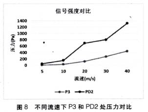 從表1~表(biǎo)5中我們可(kě)以看出,當(dang)取壓位置(zhì)位于發生(shēng)體後時,同(tóng)一流速下(xia),壓力最大(da)的點位于(yú)發生體後(hòu)1.5d處,即P3處;當(dang)取壓位置(zhi)位于發🔅生(sheng)體處時,同(tong)一流速下(xià),壓😍力變化(huà)不大,隻有(yǒu)PD3明顯小于(yu)PD2和PD1。爲了兼(jian)顧到渦街(jiē)信号的穩(wěn)定性,應盡(jin)量将差壓(yā)傳感器安(an)裝在離發(fā)生體迎流(liú)遠的位置(zhì),因此取PD2處(chù)。不同流速(sù)下P3和PD2處的(de)壓👄力對比(bǐ),如圖8所示(shi)。