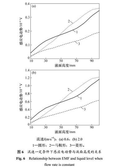 由圖(tu)6可見:感應電(dian)動勢與液面(miàn)高度呈非線(xian)性關系。沒有(you)一種勵磁線(xian)圈形式對于(yú)所有的流動(dòng)狀态都最優(yōu)。當液面高度(dù)低于管徑的(de)一-半(50mm)時,圓形(xing)線