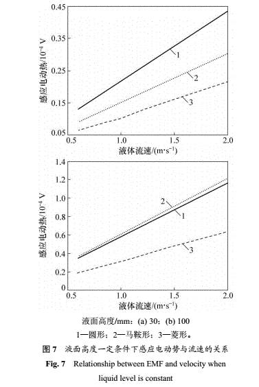 圈産生的(de)感應電動勢(shi)最大:當液面(mian)高度超過管(guǎn)徑的--半時,馬(ma)鞍形線圈産(chan)生的感應電(dian)動勢最大。由(yóu)圖7可見:感應(yīng)電動勢與流(liu)速的關系呈(cheng)線性關系,同(tóng)時,也說明了(le)滿管時馬鞍(ān)形線圈感應(yīng)電動勢大,低(dī)于半管時圓(yuán)形線圈産生(shēng)的感應電動(dòng)勢大。因此,在(zai)實際應用中(zhōng),應該根據被(bèi)測液體長時(shi)間所處的液(yè)面高度選擇(zé)最佳的勵磁(ci)線圈形狀,從(cong)而獲得盡可(ke)能大的感應(yīng)電動勢并節(jie)約經濟成本(běn),消除噪聲對(dui)測量信号的(de)影響。