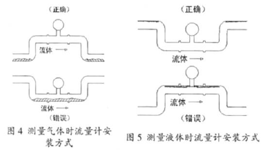 圖4是測(cè)量氣體、蒸汽(qi)時流量計的(de)安裝方式,将(jiang)流量⭐計位置(zhi)擡高,避免在(zài)流量計處聚(ju)集液體;圖5是(shi)測量液體時(shi)流量計的安(an)裝方式,将流(liu)量計位置降(jiang)低,避免在流(liú)量計處💰聚集(jí)氣💛泡。