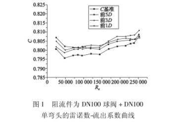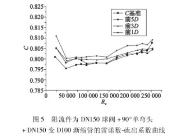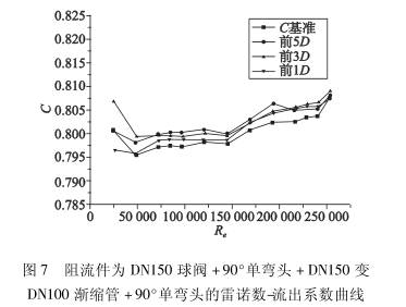 阻流件類型爲DN150球(qiu)閥+ 90°單彎頭+ DN150變DN100漸縮(suo)管+90°單彎頭的雷諾(nuò)數流出系數曲線(xian)圖如圖7所示,流出(chū)系數均略大于基(ji)準實♋驗流出系數(shù),且💞改變前直管段(duàn)長度對流出系數(shu)的影響很小。