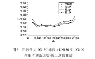 阻流件類(lèi)型爲DN150 球閥+ DN150變DN100漸縮(suō)管的雷諾數流出(chū)系數曲線圖如圖(tú)3所示,從圖中可以(yǐ)看出,随着前直管(guan)段長度的改變,流(liu)出系數基🙇🏻本不變(bian),但略小于基準實(shi)驗流出系數。