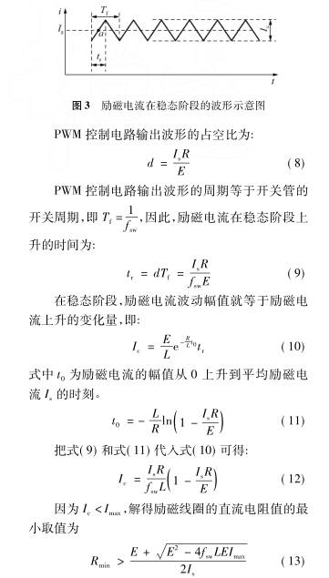 所以,爲了使(shi)基于PWM控制的脈(mò)沖勵磁系統在(zai)設定的⛷️開關⭐頻(pin)率下正常工作(zuo),且勵磁電流值(zhi)在穩态階段的(de)波動幅值小于(yú)Imax,勵磁線圈的直(zhí)流電阻值需要(yao)滿足式(7)和🔞式(13)所(suǒ)決定的範圍。