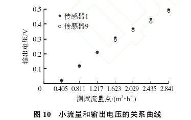由(yóu)于不同的流(liú)量範圍測量(liàng)原理不同,流(liu)量測量實驗(yan)👈分爲2部分🛀,其(qí)中小流量的(de)測量範圍爲(wei)0.405m'/h~2.841 m'/h。在不同的流(liu)量點對輸出(chu)電壓V2進行三(sān)次測量,獲得(dé)流量與平均(jun1)輸出電壓的(de)關系曲線如(ru)圖10所示。傳感(gǎn)器1在小流量(liàng)測量中🌈,不同(tóng)流量與輸出(chu)電壓關系爲(wei)星形點,測🌐量(liàng)重複性最✊大(da)值爲0.5%。傳感器(qi)9在小流量測(cè)量中,不同💔流(liú)量與輸出💃電(diàn)壓關系爲圓(yuan)形🔞點,測量重(zhong)複性最大值(zhi)爲0.8%。比較⛱️傳感(gǎn)器⁉️1和傳感器(qì)9的輸出特性(xìng),可知傳感器(qì)9由于開孔略(lue)大,輸🔴出的電(diàn)壓值略微偏(pian)小,而且重複(fu)性略大于傳(chuán)感器1,與仿真(zhen)的結果相同(tong)。