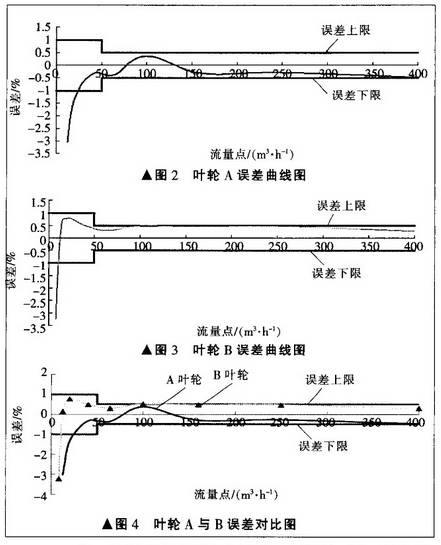 根據(jù)表3和表4作出葉輪(lun)A和葉輪B的誤差曲(qǔ)線圖,如圖2和圖3所(suǒ)🏃🏻♂️示,葉輪A在流量20~400 m2/h時(shí),0.5級是合格的,在100m3/h誤(wù)差出現突變情況(kuang);葉輪✊B在流量12~400m*/h時,0.5級(jí)是合格的。