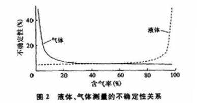 (1)高含(hán)氣的影響。多相流(liu)中氣含量過高時(shí),容易導緻部分液(ye)體分散在氣相中(zhōng),超高的氣液比是(shì)計量不準的主要(yao)原因。液體、氣體測(ce)量的不确定性關(guan)系如圖2所示。從圖(tu)2可以看出,當含氣(qì)率(R,)較低時(<65%),對液體(ti)計量誤差相對較(jiào)低,而對氣體計量(liang)的誤差較高,有時(shí)基本沒有參考價(jia)值;相反,當含氣率(lǜ)較高時(>90%),液體的計(jì)量誤差就會較大(da),有時會高于50%。