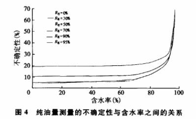 (3)高(gao)含水的影響。當被(bei)測流體高含水時(shi),被測的油量就會(hui)産生較大的誤差(cha),同樣當低含水時(shi),被測水量的誤差(chà)就比較大,其主要(yào)原因是非高精度(du)儀表對微量的計(jì)量誤差會更明顯(xiǎn)。圖4是純油量測量(liàng)的不确定性與含(hán)水率之間的關系(xi)。從圖4可以看.出,當(dāng)單井的含水大于(yú)80%時,對油的計量産(chǎn)生的誤差大于15%。