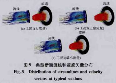 從(cong)圖7中可(kě)以看出(chū)上遊斷(duan)面流量(liang)分布較(jiào)爲均勻(yún),與管道(dao)直徑呈(chéng)線性關(guān)系,壁面(mian)附近的(de)10号斷面(mian)流量出(chū)現下㊙️降(jiàng),這是因(yin)👈爲由于(yu)壁🐪面粗(cū)糙度和(hé)壁面的(de)摩擦減(jian)了環形(xing)斷面_上(shang)的過流(liu)能力。從(cong)流量分(fèn)布曲線(xian)可🏃以看(kàn)出孔闆(pan)上遊水(shuǐ)流流态(tài)較爲穩(wen)定且,無(wu)明顯的(de)局部水(shui)頭損失(shī)。下遊斷(duan)面流量(liàng)分布失(shī)去了均(jun)勻性💘,出(chu)現了明(míng)顯的回(hui)流現象(xiàng),且流量(liàng)集中分(fèn)布在✨(0.3~0.6)D的(de)圓環面(miàn)積内,4個(gè)環形斷(duan)面占整(zhěng)個流量(liàng)了的91.35%。下(xia)遊斷面(mian)1-4号圓環(huán)斷面流(liú)量與管(guǎn)道直徑(jing)程線性(xing)關系,且(qiě)斜率是(shì)上遊斷(duan)面斜率(lǜ)的3.5倍。這(zhe)是因爲(wèi)水流經(jīng)過孔闆(pǎn)收縮後(hòu)的水流(liu)流速增(zeng)加,單位(wèi)面積上(shàng)的過流(liú)能力增(zeng)㊙️強。直徑(jìng)爲0.5D圓環(huán)斷面以(yi)後🏃的斷(duan)面流量(liang)随着半(ban)徑增✨加(jiā)而急劇(jù)減小,這(zhè)是因爲(wei)孔闆開(kāi)🌍孔比爲(wèi)0.635446,且受水(shui)流收縮(suō)效應的(de)影響,0.5D以(yǐ)後斷面(miàn)水流流(liu)速明🐅顯(xiǎn)減小,過(guo)流能力(li)受到限(xian)制所✌️緻(zhi)。下遊斷(duan)面0.8D後斷(duan)面的流(liú)量随着(zhe)直徑的(de)增大截(jie)面回流(liu)流量📞增(zeng)大,形成(chéng)了孔闆(pǎn)後下遊(yóu)斷面的(de)渦流負(fù)壓區,給(gei)差壓測(cè)量創♋造(zào)了條件(jiàn)🏃🏻。 3種工況(kuang)的流量(liàng)分布趨(qū)勢基本(ben)一緻,3種(zhong)工況💞各(gè)自的❤️回(huí)流總量(liàng)在15.6%左右(yòu)。以下遊(you)典型斷(duàn)面爲起(qi)點,繪制(zhì)三🍓維流(liu)線圖和(hé)典型斷(duan)面上的(de)流速分(fen)布圖,如(rú)圖8。