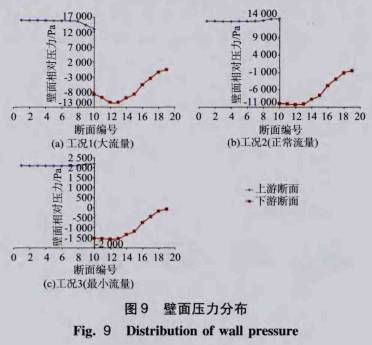 爲了(le)衡量取(qǔ)壓口的(de)位置選(xuǎn)取是否(fou)合理,本(běn)文取出(chū)了管壁(bì)附近管(guan)道相對(duì)壓力,并(bing)繪制曲(qu)線如圖(tu)9。上下遊(yóu)特征斷(duàn)面沿💃🏻直(zhi)徑方向(xiang)💔平均分(fèn)爲600份,爲(wei)了使結(jié)果✏️具有(yǒu)代表性(xing),取最外(wài)側壁面(miàn)附近圓(yuán)環(1/600管道(dào)内徑).上(shàng)的平均(jun1)相對壓(ya)力作爲(wei)壁面壓(ya)🔅力。上下(xia)遊🏃♀️各取(qǔ)10個斷☁️面(mian),從上遊(you)對斷面(miàn)進行編(bian)号依次(cì)爲1至🏃🏻19号(hào)斷面。