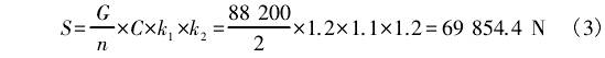 式中:S爲(wèi)鋼絲繩的容(róng)許拉力,N;G爲吊(diào)物重量,N;n爲鋼(gang)絲繩分支數(shu);C爲角度系數(shu),取1.2;h;爲動荷系(xi)數,取1.1;k2爲不均(jun1)衡系數,取1.2。