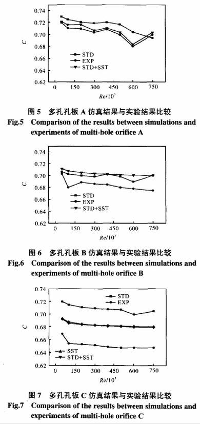 STD、SST,STD+SST.圖5~圖(tu)7是STD模型、SST模(mo)型及STD+SsT組合(he)形式在同(tong)一雷諾數(shu)範圍内對(duì)不⛱️同📐結構(gòu)的多孔孔(kong)闆流量計(ji)計算得出(chu)的流出系(xì)👌數C.值和實(shi)流實驗值(zhí)(EXP)的比較.每(měi)個湍流模(mo)型的8個仿(pang)真實驗點(dian)對應人💋口(kou)流速分别(bie)爲0.5m/s.1.0m/s、2.0m/s、3.0m/s、4.0m/s、5.0m/s、6.0m/s和7.5m/s.