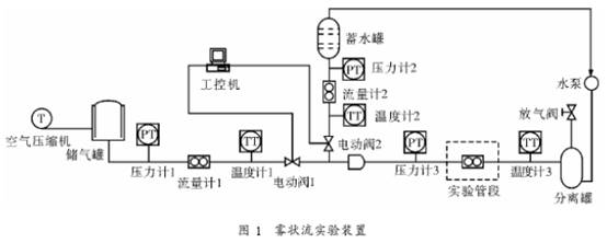 空氣壓(yā)縮機将空氣(qì)壓縮後送入(ru)儲氣罐,流量(liàng)計1計⛱️量氣液(yè)混合前儲氣(qì)罐送入管道(dao)的氣體流量(liàng)。蓄水罐距離(li)地面30m提供實(shí)驗所需的液(ye)相,其流量由(yóu)流量計2測得(dé)❄️。氣相和液相(xiàng)經混和器混(hun)和後📞送入實(shi)驗管段,最後(hòu)流入分離罐(guan)👣将水和空氣(qi)進行分離,空(kōng)氣由放氣閥(fa)排出,水由水(shui)泵送回蓄水(shui)罐循環使用(yòng)。。工控機對所(suo)有儀表數據(ju)進行采集和(he)顯示并對兩(liǎng)個電動調節(jiē)閥進行控制(zhì),調節氣相和(he)液相的流量(liang)