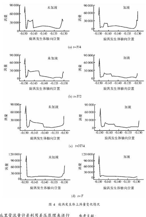首先對渦街(jie)流量傳感器(qì)沒有液相加(jia)入時渦街壁(bì)面.上渦量的(de)變化情況進(jin)行了記錄。圖(tú)4反映的是當(dāng)入口速度爲(wèi)20m/s時,一個周期(qi)内不同時刻(kè)旋渦發生體(tǐ)🧡壁面,上🔴渦量(liàng)的變化情✌️況(kuang),以及當氣體(tǐ)中注入液體(tǐ)🏃♀️含率爲0.1%時旋(xuán)渦發生體上(shàng)一個周期内(nei)不同時刻的(de)✔️渦量變化。未(wei)加入液相時(shi)可以看到旋(xuan)渦在旋渦發(fa)生體上從産(chan)生🏒到逐漸長(zhǎng)大最後從旋(xuán)渦發生體上(shang)脫落的整個(gè)過程,在開始(shǐ)時刻邊界層(ceng)在旋渦發生(shēng)🏃🏻♂️體的銳邊開(kai)始卷積🧑🏽🤝🧑🏻形成(cheng)旋渦,随後旋(xuán)渦逐漸變大(da),渦量比初始(shi)時相對減小(xiao),最後旋渦從(cong)旋渦發✨生體(ti)上脫落,旋渦(wo)發生體壁面(miàn).上的渦量變(biàn)爲零。由圖4進(jìn)行比較可以(yi)明顯地看出(chū),在加入液相(xiang)以後液相的(de)💃存在影響了(le)氣體邊界層(céng)💜在壁面🐇上的(de)卷積,旋渦發(fa)生體上的🤩渦(wo)量明顯減小(xiǎo)。