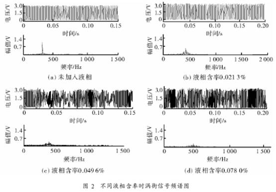 實驗的過程(cheng)中保持氣相(xiàng)流量爲141m3/h,對應(yīng)的流速爲20m/s,管(guan)道🧡中液相體(tǐ)積含率分别(bie)爲0.0106%、00213%、0.0355%、0.0496%、.0.0638%、0.0780%、00922%。以5000Hz的頻率(lü)對不同液相(xiàng)含率下電荷(hé)放大器産生(sheng)的正弦信号(hào)進行采樣,每(mei)次采樣10組數(shu)據,每組數據(ju)有104個采樣點(dian),然後把得到(dao)的采樣點進(jin)行傅立葉變(biàn)換,得📧到不同(tóng)液相含率下(xià)渦街産生的(de)🌂頻率.,不同液(yè)相含率時渦(wo)街信号的頻(pín)🚶♀️譜圖如圖2所(suǒ)🔴示。