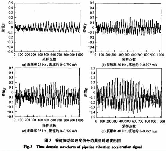 試驗工(gong)作狀态:分别調節(jie)流速約爲0,0.209,0.403,0.611,0.797m/s,控制水(shui)流速的大小,并在(zài)每--開度下,再分别(bié)設置水泵工作頻(pín)率爲25,30,35,40Hz.加速🤟度傳✏️感(gǎn)器的模🚩拟輸出信(xìn)号輸人到PC機的A/D采(cai)集卡,采樣頻率1000Hz.對(dui)不同流速和泵頻(pín)率組合下的管道(dao)💋振動信号進行數(shu)據采集和頻譜分(fèn)析.圖3爲所有組合(he)下,采樣得到的管(guǎn)道振動加速度信(xìn)号的典型時域波(bō)形圖.圖中👣橫坐标(biāo)爲采樣的點數,共(gòng)1024點;縱坐标爲相對(dui)于Og标定值的差值(zhi),縱坐标基準值0對(dui)應了0g的㊙️标定值.圖(tú)4所示爲對應的管(guan)道振動信号的典(diǎn)型頻譜圖.
