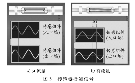 當U形(xing)管内無流體流過(guò)時,振動管不産生(shēng)扭曲,振動㊙️管兩側(cè)電磁信号檢測器(qi)檢測到的信号是(shi)同相位的,見圖3a;當(dāng)U形管内有流體流(liu)過時,振動管在力(li)矩作用下産生扭(niǔ)曲,2個檢測器間将(jiāng)存在相位差,見圖(tú)3b。用變送器測量左(zuo)、右檢測信号之間(jian)的滞後時間,将這(zhe)個時間差乘⚽以流(liú)量标定💛因數,就可(kě)确定質量流量。因(yin)此,質量流量越大(dà),扭曲越大,也即相(xiang)位差越大。
