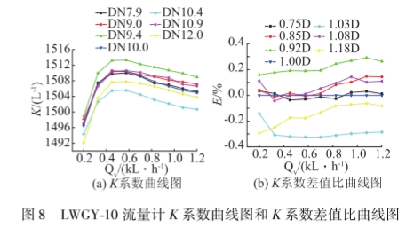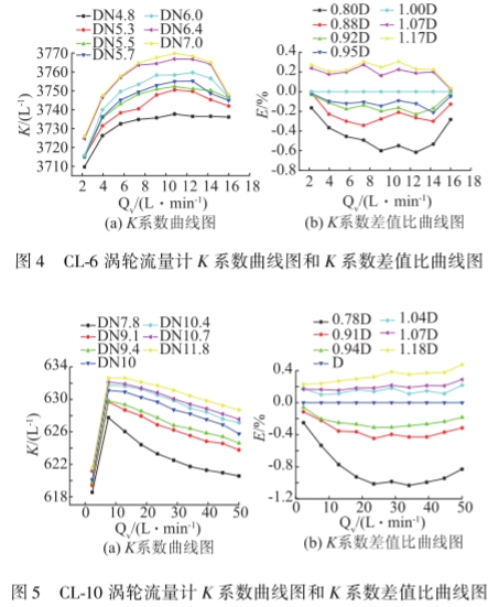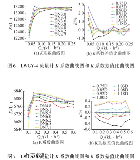 圖3圖5别爲(wei)流量計的K系數(shù)曲線圖和無量(liàng)綱化後的差值(zhí)比曲線圖。