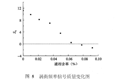 式中(zhōng): Ps爲渦街頻率帶0. 96 f到(dào)1. 04 f範圍内的能量,其(qi)中信号能量通過(guò)譜分析獲得。R爲總(zǒng)能量減去Ps後的能(neng)量。如果Sq爲正,則渦(wō)街頻😘率帶👣的能量(liàng)大于其它頻帶的(de)能量。在M iau's l和Pankan in'的文章(zhang)中對Sq的定義有詳(xiáng)細說明。實驗中利(li)用這種方法👈得到(dao)了渦街頻率信号(hào)品質随液相含率(lü)🏃♂️變化的情況,如圖(tú)5所示。Sq總的變化趨(qu)勢是随着液相含(han)率的增加而迅速(su)減小,在液相含率(lü)大于0106%後s由正變負(fu),渦街頻率帶的能(néng)量開始小于其它(tā)頻率帶的能量,信(xìn)号品質将變得很(hěn)差。