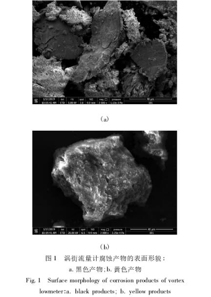 渦街流量計(ji)在四氧化二(er)氮加注系統(tǒng)中長期使用(yong)💋,其表面存在(zài)一定厚度且(qie)分布不均的(de)黑色和黃色(se)腐蝕産物,黑(hēi)色腐蝕産物(wù)數量明顯更(geng)多。爲了觀察(cha)腐蝕産🙇♀️物的(de)微觀表面形(xíng)貌,将其從渦(wo)💘街流量計表(biao)面剝離并進(jìn)行SEM分析📐,其形(xíng)貌如圖1所示(shì)。