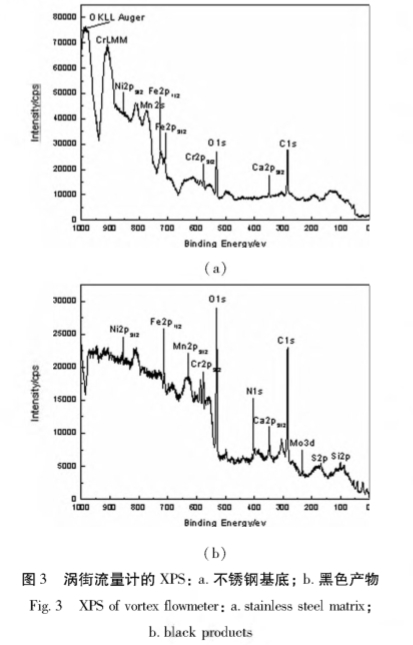 将渦街流(liu)量計的不鏽(xiu)鋼基底和黑(hēi)色腐蝕産物(wu)進行XPS分析,其(qí)測試結果如(ru)圖3所示。由圖(tu)3可見,不鏽鋼(gang)基💜底含有C、Ca、O、Fe、Mn、Ni、Cr等(děng)元素;黑色✉️腐(fu)蝕⚽産物含有(you)Si、S、C、Ca、N、O、Cr、Fe、Mn、Ni等元素。N元素(su)的分析與EDAX分(fèn)析結果一緻(zhì);Si、大量Fe單質和(he)少量Fe的氧化(hua)物形式存在(zai)☀️;黑色腐蝕産(chǎn)物中Fe主要以(yi)Fe2O3形式❤️存在。不(bu)鏽鋼基底和(hé)黑色腐蝕産(chan)物Cr2p3/2的電子結(jié)合能分别爲(wei)574.4eV和576.7eV,與标準圖(tú)譜Cr2p32中單質Cr的(de)574.1eV和Cr2O3的576.6eV比較可(kě)知,不鏽鋼基(ji)底中Cr元素主(zhǔ)要以單質Cr存(cun)在,黑色腐蝕(shi)産物中Cr元素(sù)以Cr203形式存在(zai)。同理分析,黑(hei)色腐蝕産物(wu)中⁉️Ni元素以Ni2O3形(xíng)式存在。黑色(sè)🈚腐蝕産物中(zhōng)NIs的電子結合(hé)能爲398.0eV,與NH.NO,的電(diàn)子結合能398.5eV相(xiàng)對接近,故黑(hēi)色腐蝕産物(wù)中N元素最可(kě)能以NO,形式存(cun)在。