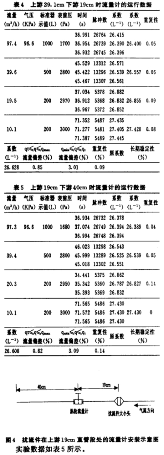 實驗數據(jù)如表4所示。從(cong)表4可以看出(chū),擾流件安裝(zhuāng)在距流t計上(shàng)遊端接近5D處(chù)時,其運行數(shu)據的流量偏(piān)差(qmin≤q≤qt部分)>3%,不滿(man)足國家标準(zhun)的要求,但其(qí)重複性符合(hé)流量計的國(guó)家标準。
