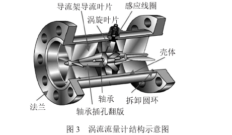 結構示意(yi)圖,該流量計屬(shu)于速度式流量(liang)計,主要包括感(gǎn)應線圈、渦輪葉(ye)片、倒流架導流(liú)葉片、管道殼體(tǐ)等部件。