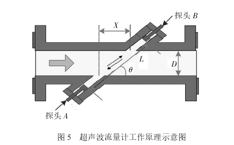 是通過(guò)檢測流體流動(dong)對超聲脈沖的(de)作用來測量流(liu)量的一種非接(jiē)觸式流量計。圖(tú)5所示爲采用時(shi)差法測㊙️量原理(lǐ)的⛷️超聲波流量(liàng)計,當超聲波在(zài)成品油長輸管(guan)道中傳輸時,探(tan)頭A與探頭B分别(bie)檢測接收對📐方(fang)發射的超聲波(bō)脈沖,由于順流(liú)方向聲波傳播(bo)速✊度大于逆流(liu)方向聲波傳播(bo)速度,則相同傳(chuan)播距離下就會(hui)得到不同的傳(chuán)播時間,利用傳(chuán)播時間之差即(jí)可計算🛀原油的(de)流速與流量,計(ji)算🔱公式如下: