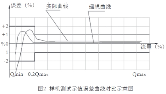 圖2所示,在進(jin)行DN100型氣體渦(wō)輪流量計的(de)樣機試制過(guò)程中,經🔞測試(shi)發現,流量計(jì)的大流、中流(liu)段的示值誤(wù)差趨于線型(xíng),而最小流量(liàng)點(Qmin)示值誤差(cha)卻超出标準(zhun)要求。