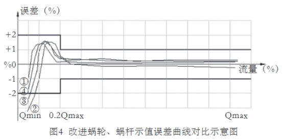 根據渦杆(gǎn)、渦輪成形原(yuán)理,渦杆、渦輪(lún)傳動實際是(shì)由螺♌旋齒輪(lun)傳動演化而(er)來的。螺旋齒(chǐ)輪傳動相齧(nie)合📞的輪齒是(shi)點接觸,爲🚶了(le)改善齧合狀(zhuàng)況,才将渦杆(gǎn)渦輪的齧‼️合(he)變爲線接觸(chu)。線接觸的阻(zǔ)力要大于點(diǎn)接觸,于是将(jiang)🏃♀️弧形面的渦(wō)輪用螺旋齒(chi)輪替代,如圖(tú)3(c)。結果表明這(zhe)種改進非常(chang)有效,流量計(ji)傳😘動阻力減(jiǎn)小📞、靈活性提(ti)高;傳動平穩(wěn)、重複性良好(hao),小流量段的(de)示值誤差達(da)到标準要求(qiu),如圖4示值誤(wu)差曲線④。