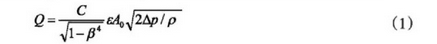 式中:Q爲體積流量(liàng);β爲直徑比,β=d/D;d爲工作(zuo)條件.下節流件的(de)孔徑;D爲工作條件(jian)下.上遊管道内徑(jing);A。爲節流件的開孔(kǒng)截面積;C爲流出系(xi)數;OP爲節流裝置前(qian)後實際測得的差(cha)壓;p爲節流裝置上(shàng)遊流體密度;e爲可(ke)膨脹系數。